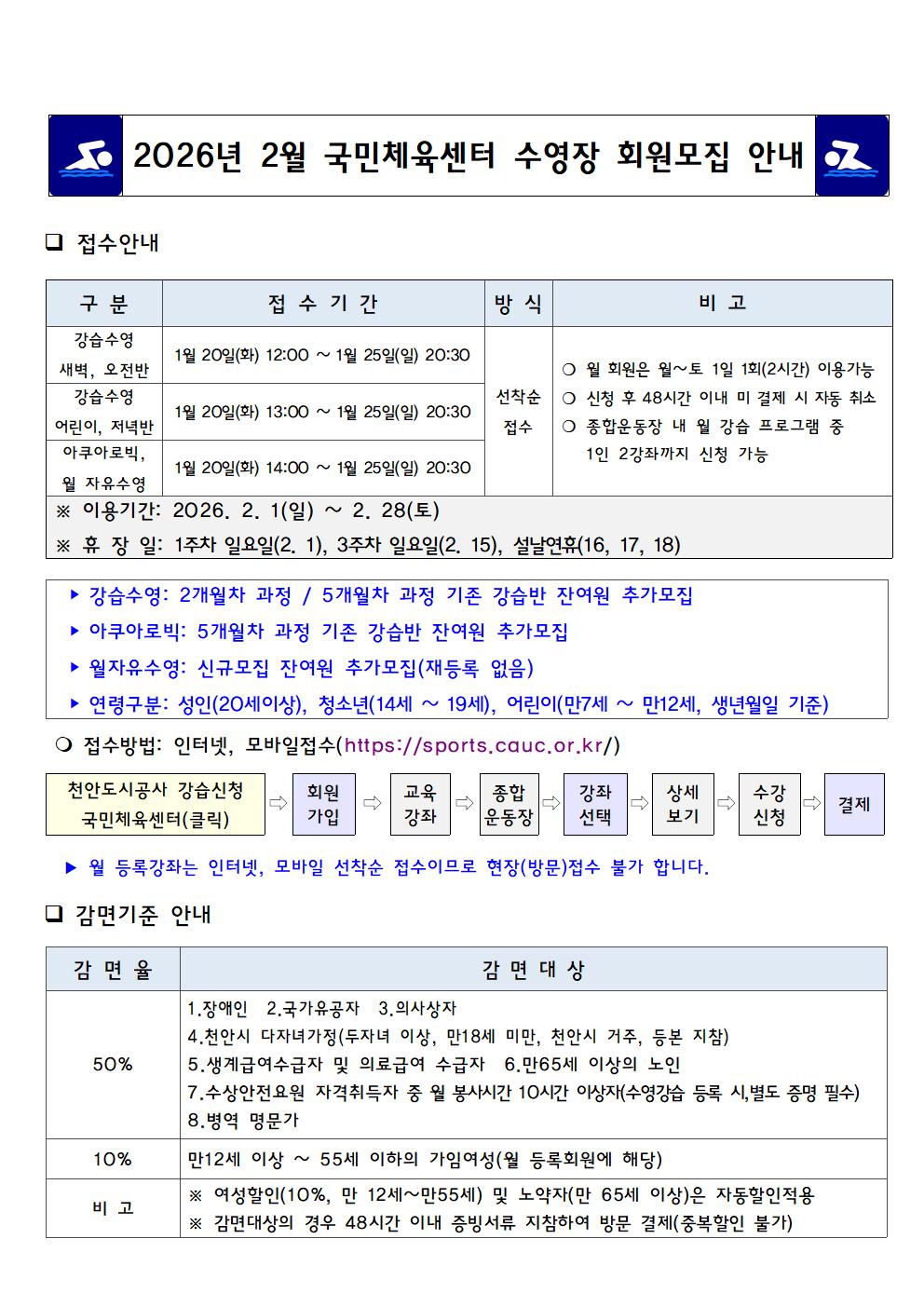 | 2026³â 2¿ù ±¹¹ÎüÀ°¼¾ÅÍ ¼ö¿µÀå ȸ¿ø¸ðÁý ¾È³» | |