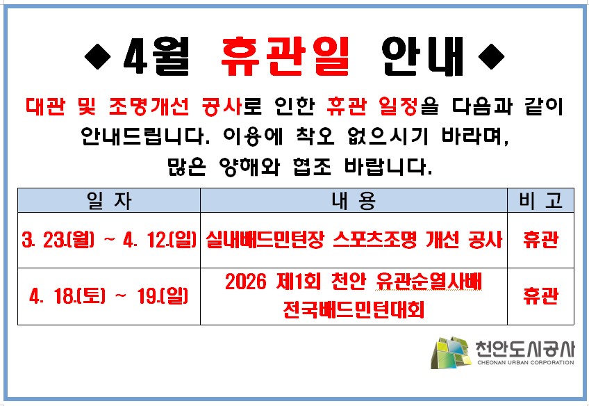2026³â 4¿ù ½Ç³»¹èµå¹ÎÅÏÀå(û´çµ¿) ÈÞ°üÀÏ ¾È³»